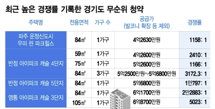 "시세보다 3억 싸네"…서울 '내 집' 포기하고 수도권 무순위 청약 '우르르'2만 대 1 경쟁률 돌파, '줍줍' 열풍의 이유와 바뀐 청약 제도를 알아봅니다.정부의 대출 규제와 높은 집값 부담으로 서울 내 집 마련이 어려워지자, 청약 수요자들이 시세보다 저렴한 수도권 '무순위 청약(줍줍)'으로 몰려들고 있습니다. 수억 원의 시세차익 기대감에 일부 단지는 수만 대 일의 경쟁률을 기록하는 등 과열 양상마저 보이고 있습니다.🔥 2만 대 1 돌파, 경기도 무순위 청약 광풍최근 경기도에서 나온 무순위 청약 물량은 그야말로 '역대급' 경쟁률을 기록하며 시장의 뜨거운 관심을 입증했습니다.영통 아이파크캐슬 3단지: 전용 84㎡ 1가구 모집에 22,883명이 몰리며 최고 경쟁률을 기록했습니다.반정 아이파크캐슬 4·5단지..