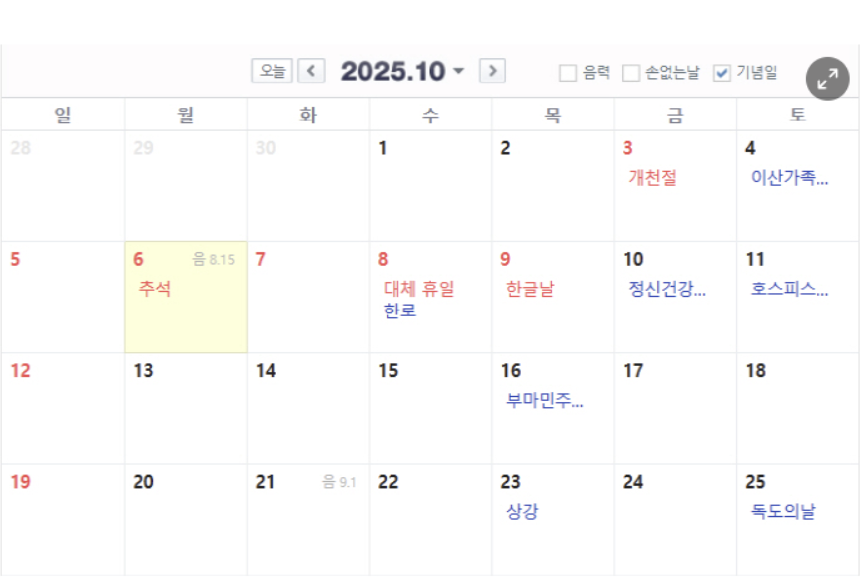 2025 추석 황금연휴최대 10일, 연차 전략 총정리2025년 10월, 개천절부터 한글날까지 이어지는 역대급 황금연휴가 찾아옵니다. 기본 7일부터 최대 10일까지 쉴 수 있는 꿀같은 기회! 지금부터 현실적인 연차 사용법과 연휴 준비 팁을 완벽하게 정리해 드릴게요. 2025년 10월 황금연휴 핵심기본 7일 휴무 확정, 연차 1일 사용 시 최대 10일 가능!1. 2025년 추석 연휴, 달력부터 제대로 보기올해 추석은 개천절과 한글날 사이에 절묘하게 위치해, 별도의 연차 사용 없이도 긴 휴가를 즐길 수 있는 구조입니다.10/3(금) 개천절 → 10/4(토) ~ 5(일) 주말 → 10/6(월) ~ 7(화) 추석 연휴 → 10/8(수) 대체공휴일 → 10/9(목) 한글날결론: 10월 3일(금)부터 10월 9일(목..